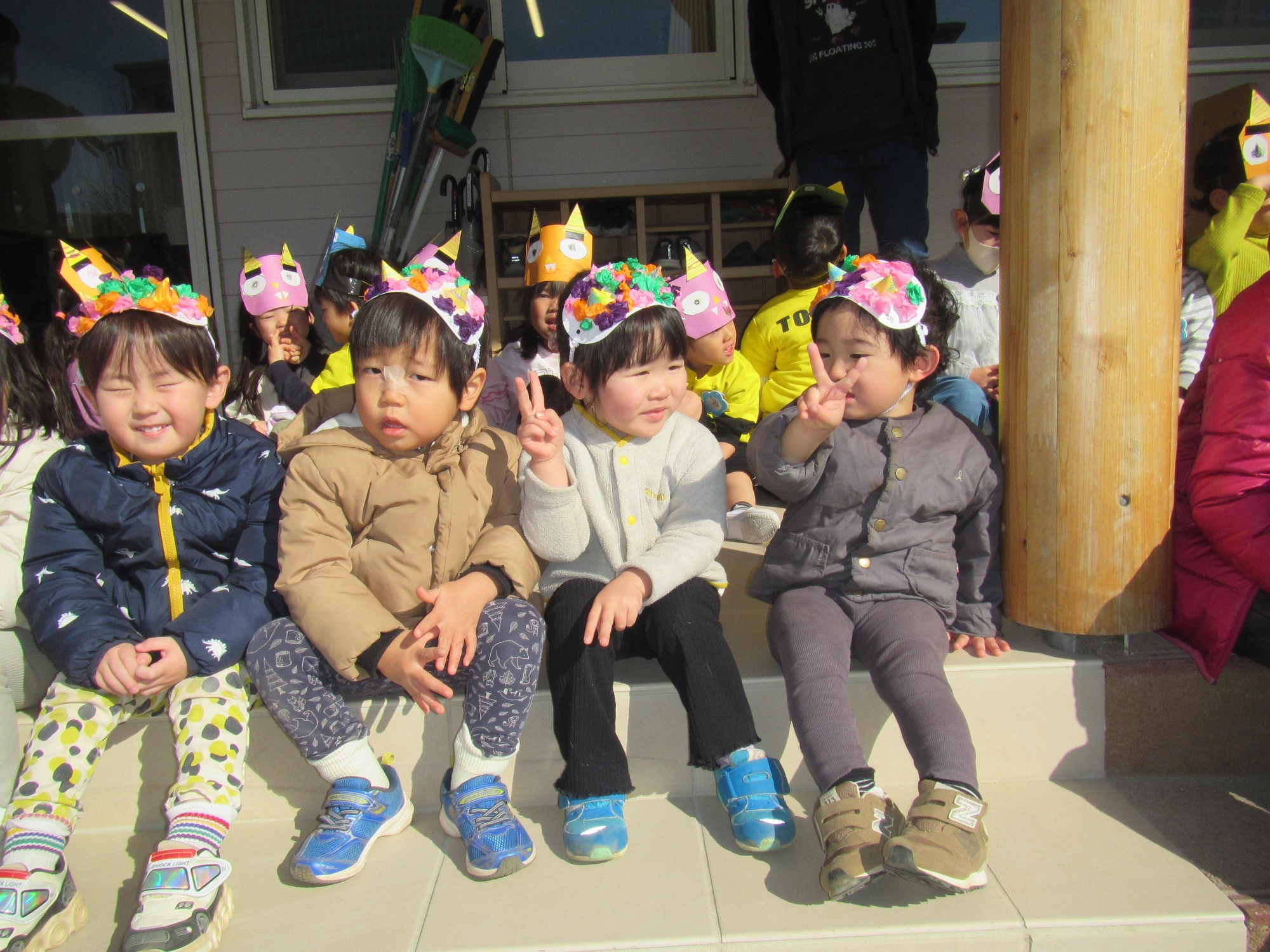 すみれ組は、自分でつくったおにのヘアバンドをつけていきました♪
