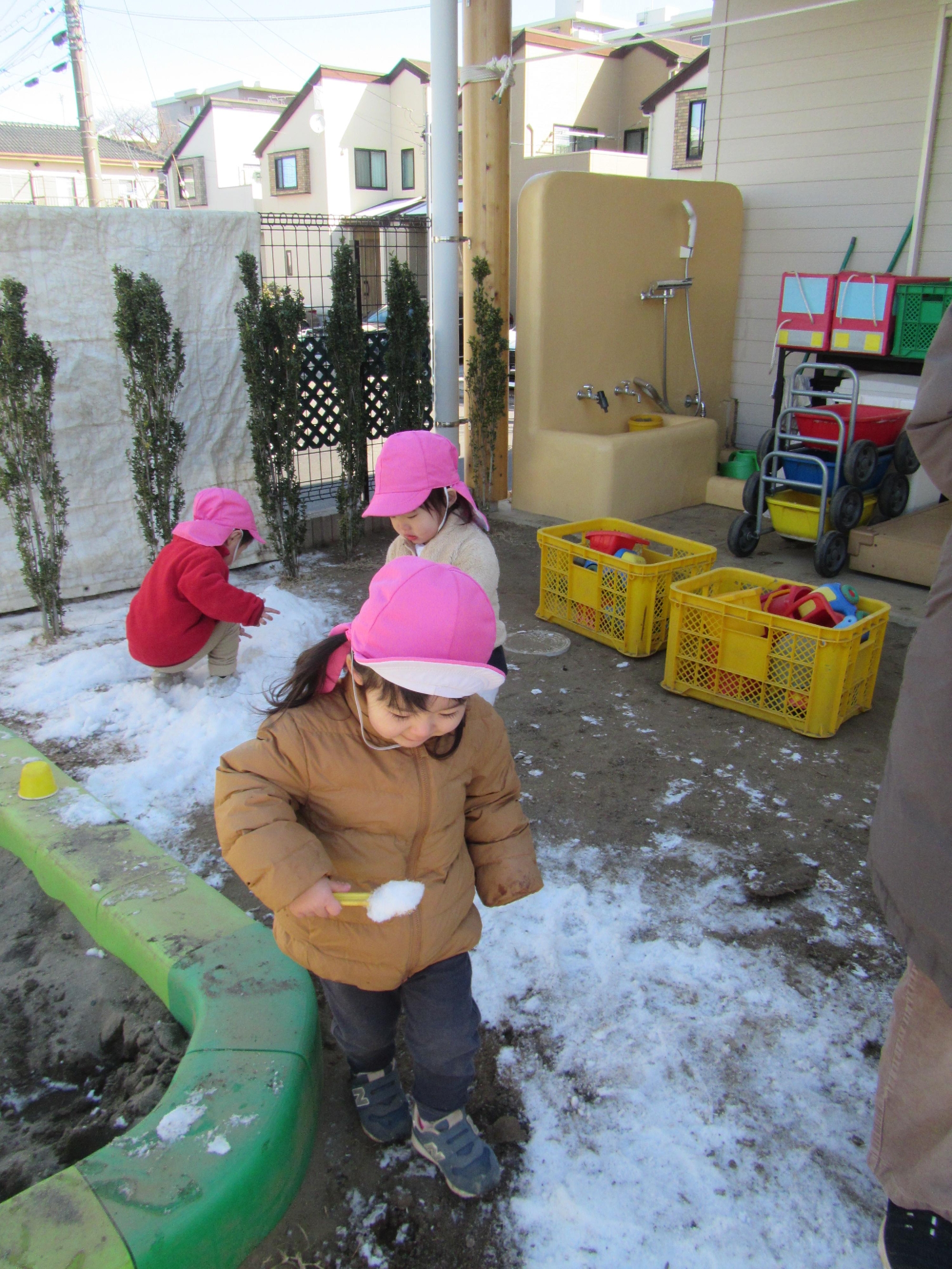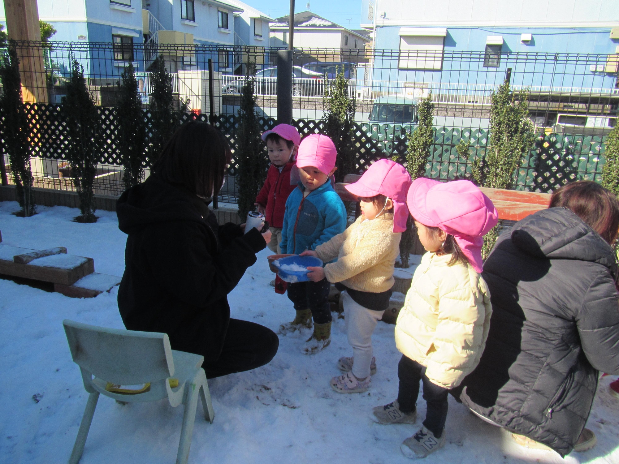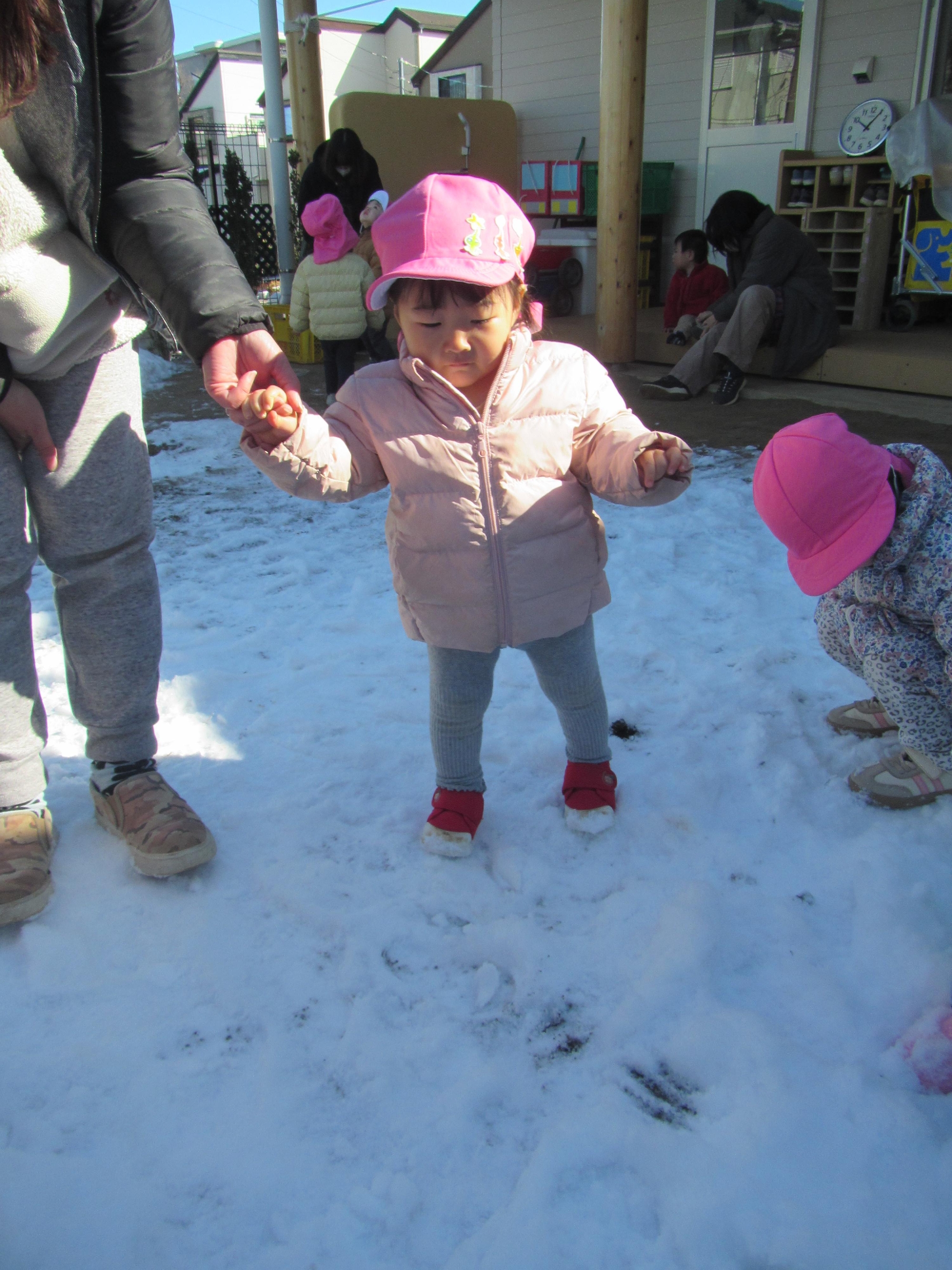 雪の上を歩いた感触、ふわふわの雪を触ってみた冷たさなど、滅多にない雪をみんなで楽しむことができました。
