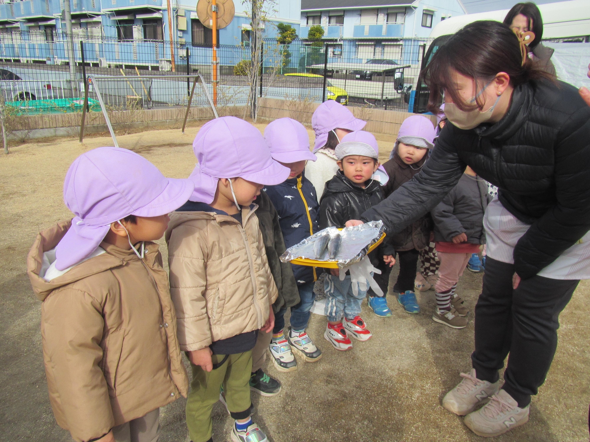 節分を前に、るり組は園庭でいわし焼きをしました。ぼたん組とすみれ組も見せてもらいに行きましたよ♪
